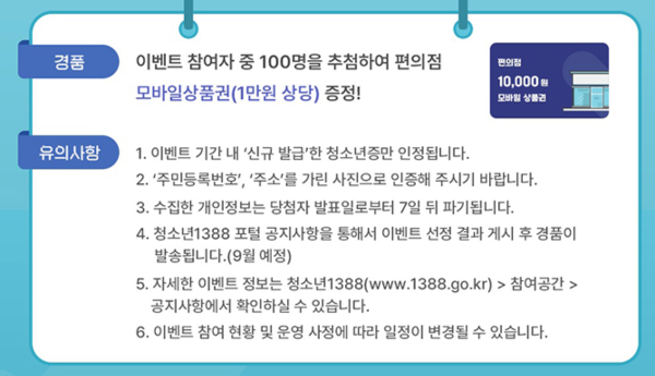 올해 여름방학 동안 청소년증 발급 후 인증을 완료하면 편의점 모바일 상품권 1만원권을 추첨을 통해 증정하는 이벤트가 열리고 있습니다. 이벤트는 2025년 7월 15일부터 8월 29일까지 진행되며, 참여 방법은 다음과 같습니다.
