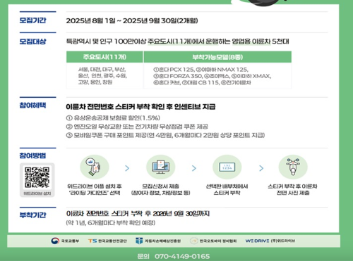 전체 신청자 중 5,000명에게 지급되며, 영업용 오토바이 전면번호 스티커 설치 후 설문조사 및 교통법규 위반, 사고 데이터 등을 분석해 제도 도입 여부를 검토합니다.